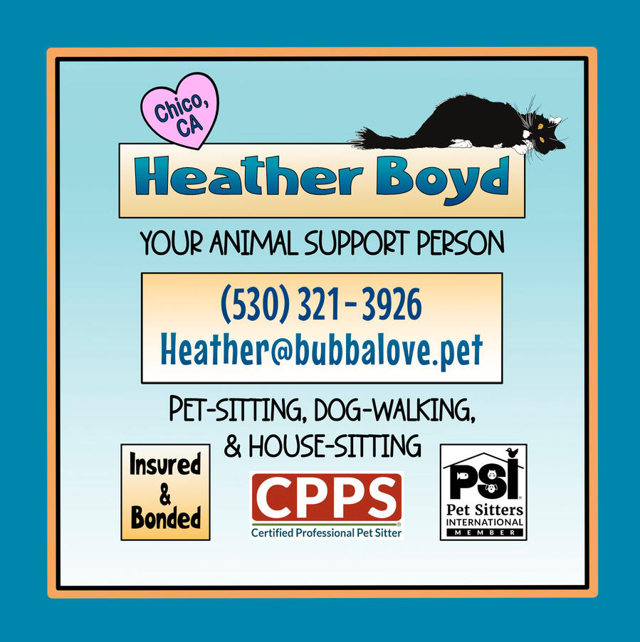 My name is Heather Boyd, and I provide personalized, in-home pet-sitting and dog-walking in Chico, CA. I became interested in professional pet-sitting after having a bad experience with some neighbors taking care of my cats while I was on vacation. I know how stressful it can be to leave a beloved pet in someone else’s hands. My mission is to provide peace of mind to people by giving reliable, thoughtful, and nurturing care to their animals.